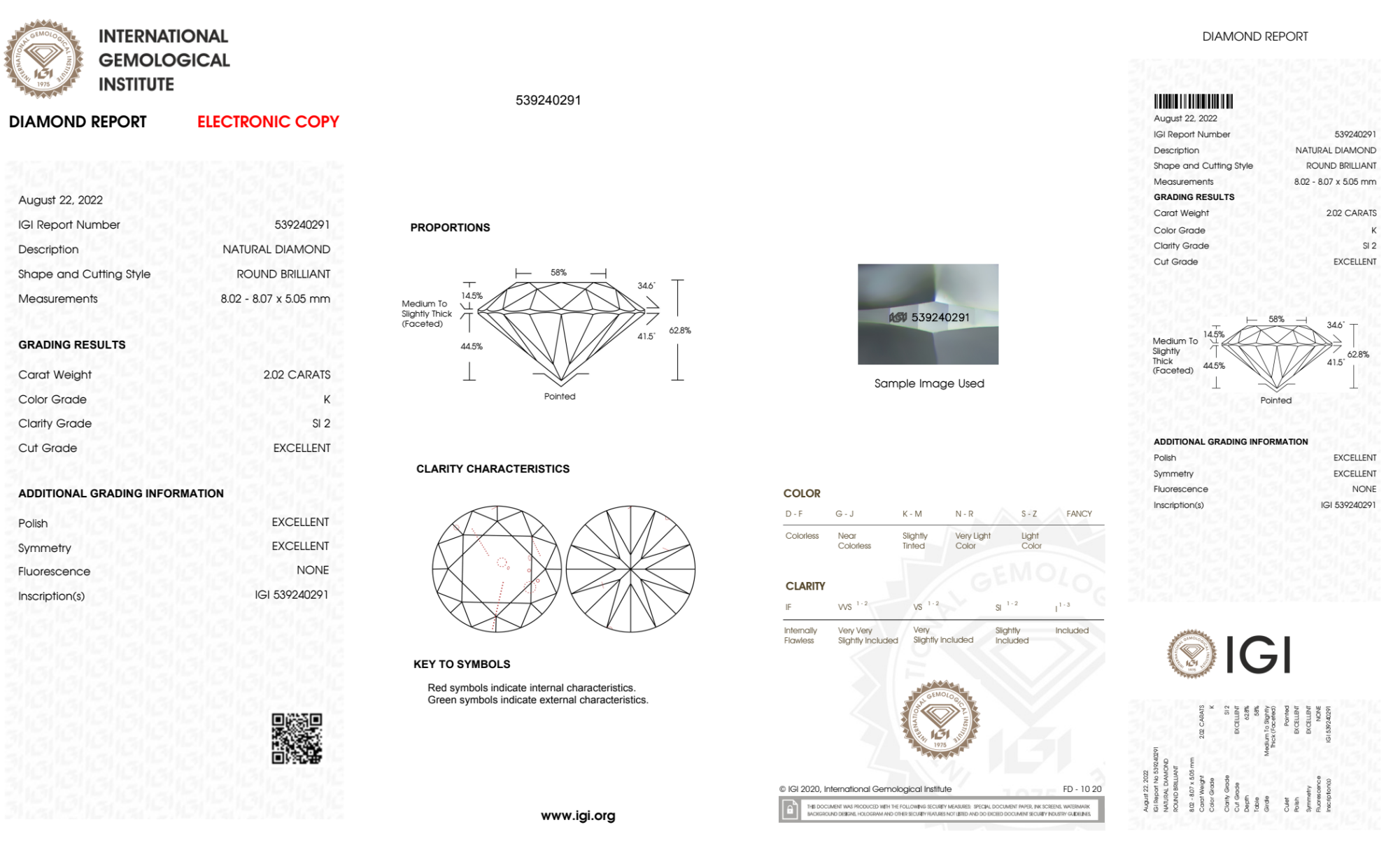 Your 2.02 carat Round natural diamond is graded K color (Faint Color), and you can read more about K color diamonds here.