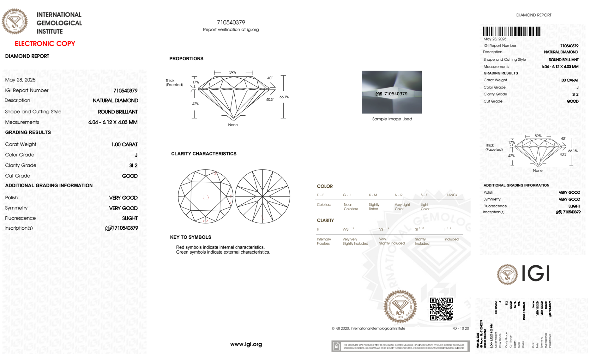 Your 1.00 carat Round natural diamond is graded J color (Near Colorless), and you can read more about J color diamonds here.