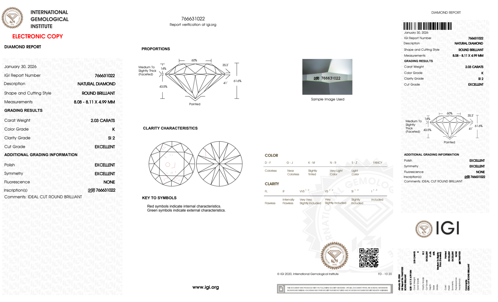 Your 2.03 carat Round natural diamond is graded K color (Faint Color), and you can read more about K color diamonds here.