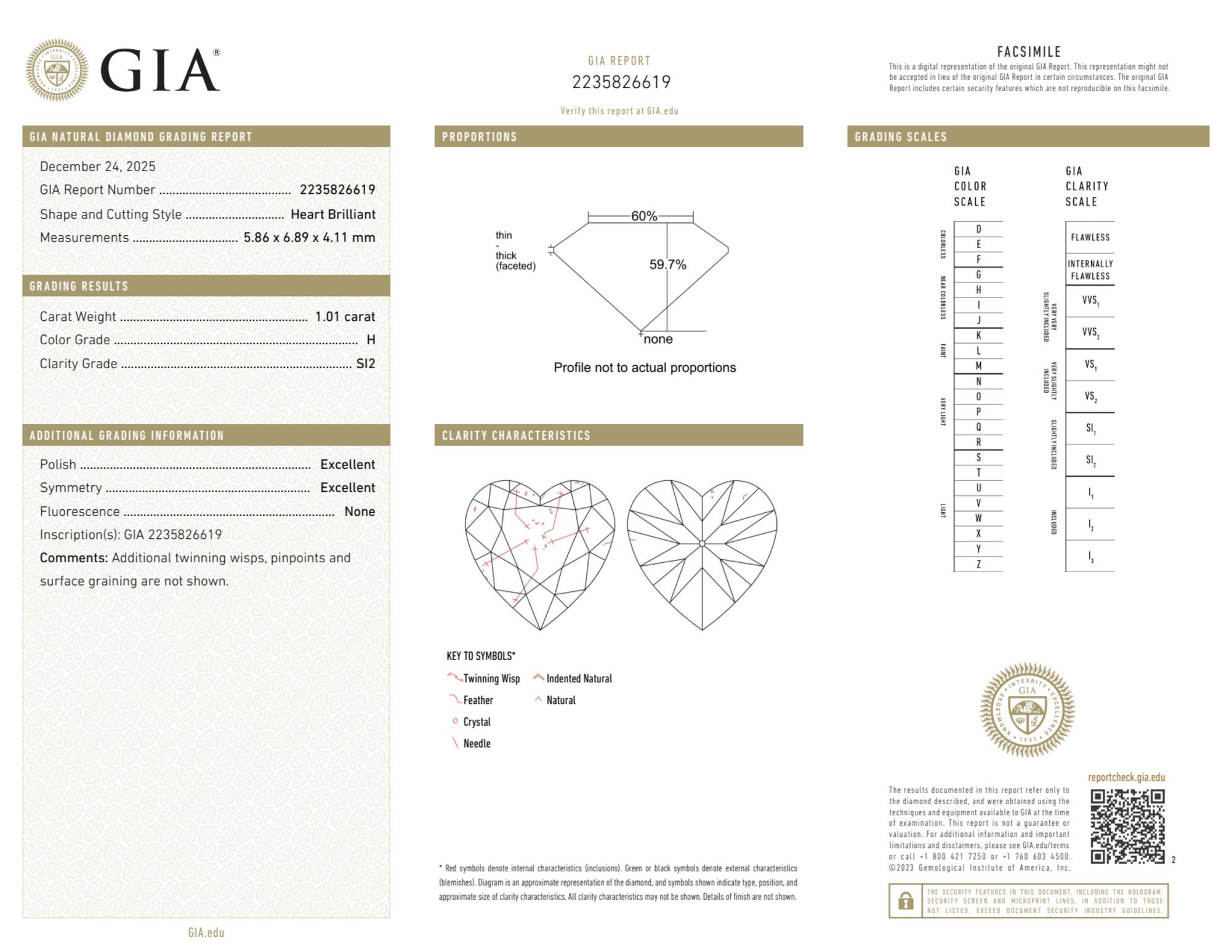 Your 1.01 carat Heart natural diamond is graded H color (Near Colorless), and you can read more about H color diamonds here.