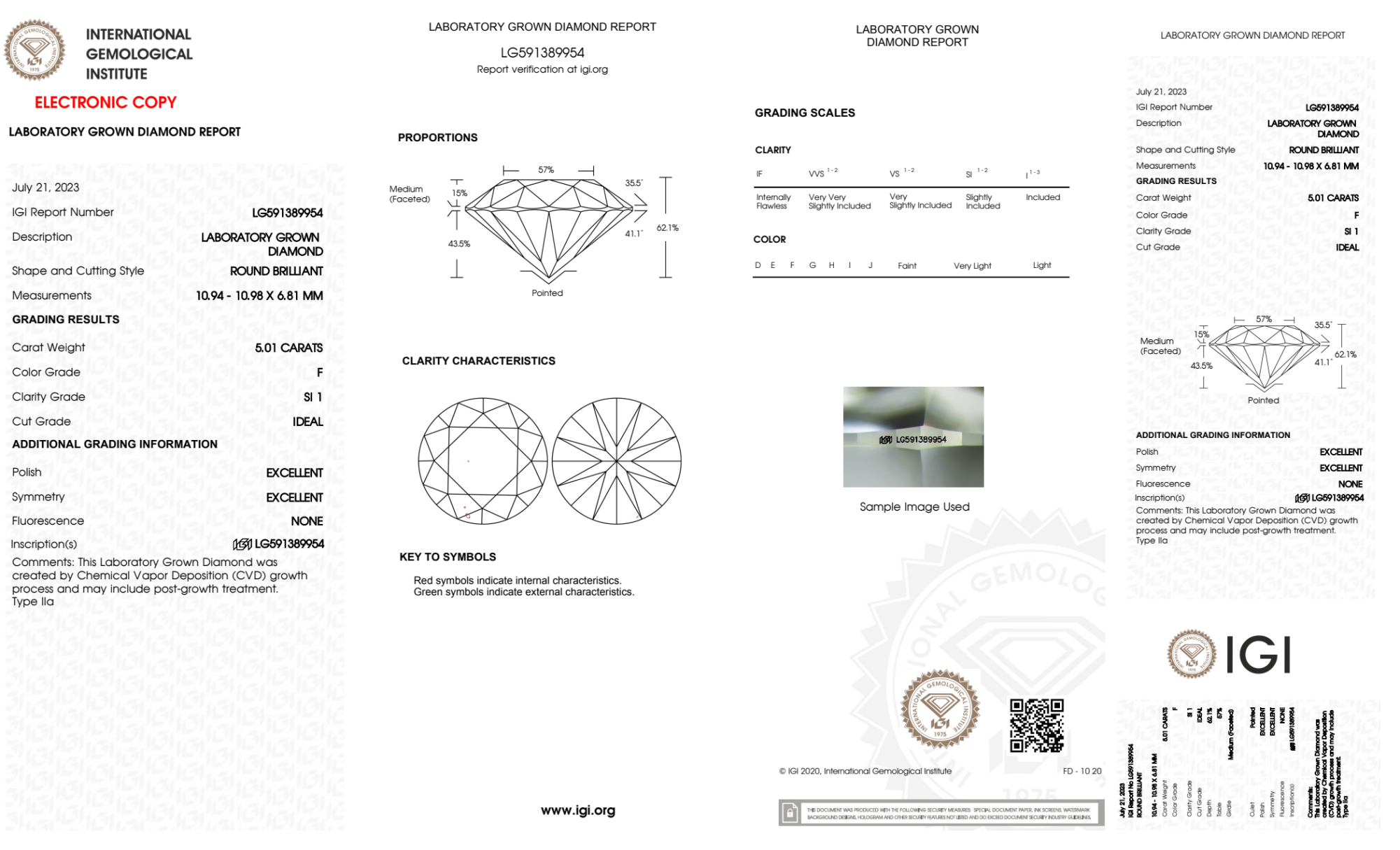 Your 5.01 carat Round lab diamond is graded F color (Colorless), and you can read more about F color diamonds here.
