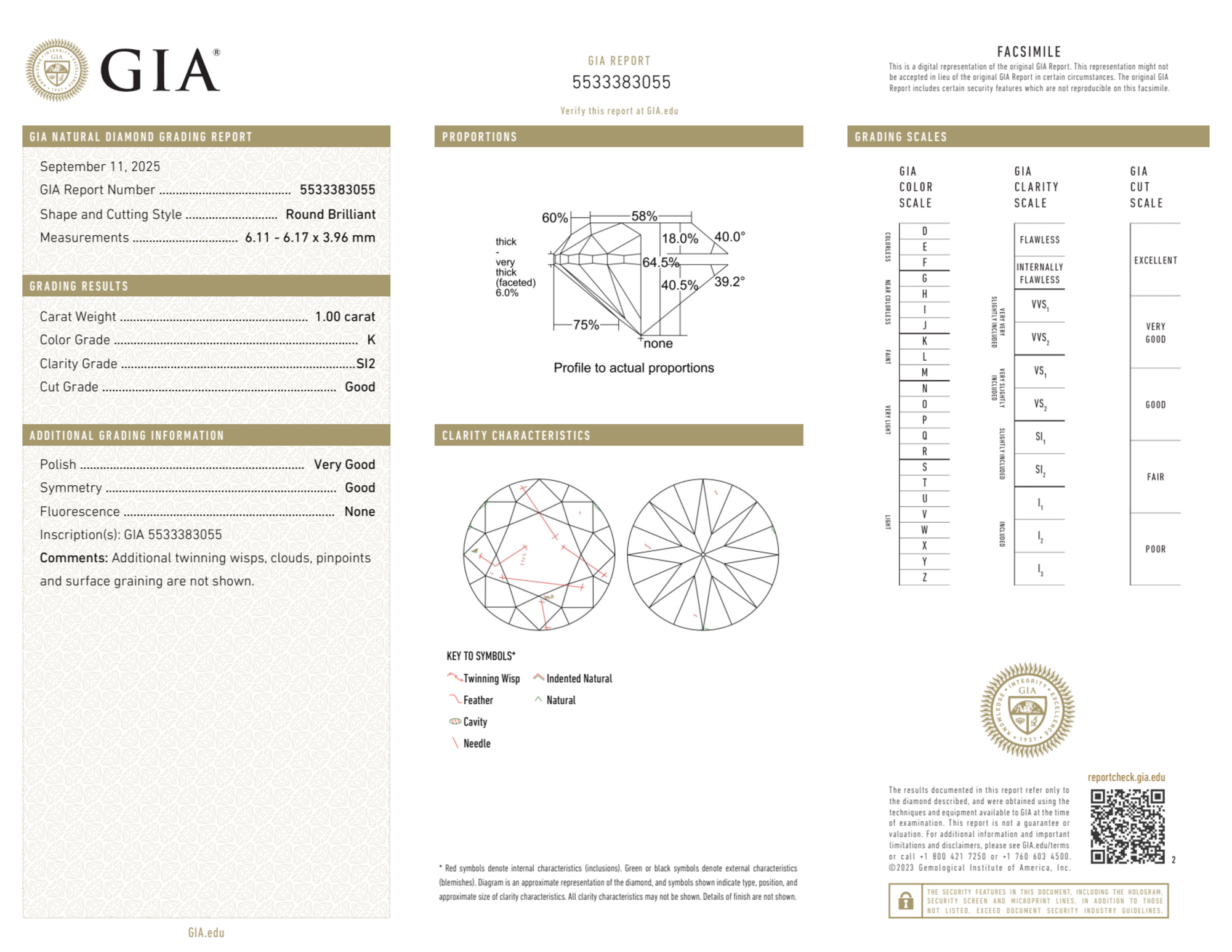 Your 1.00 carat Round natural diamond is graded SI2 clarity, which stands for Slightly Included 2. Read more about SI2 clarity diamonds here, or learn more about diamond clarity in general here.