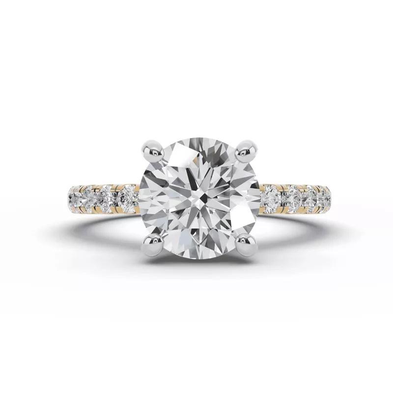 Signature Hearts & Arrows pavé lab diamonds ascend the band with bold sparkle, drawing the eye to a center stone nestled in a hidden halo basket. Precision cutting enhances brilliance at every angle.